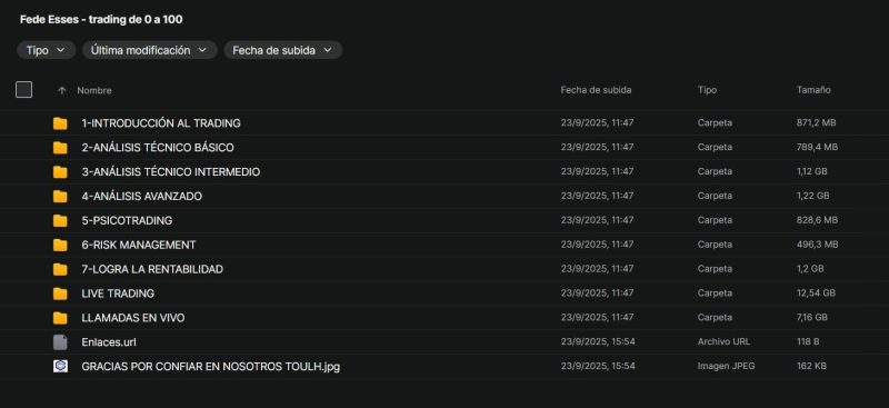 El Curso Trading De 0 a 100 de Fede Esses es un programa completo que te guía paso a paso: desde los fundamentos básicos hasta las técnicas más avanzadas, combinando análisis técnico, gestión de riesgo y psicotrading.